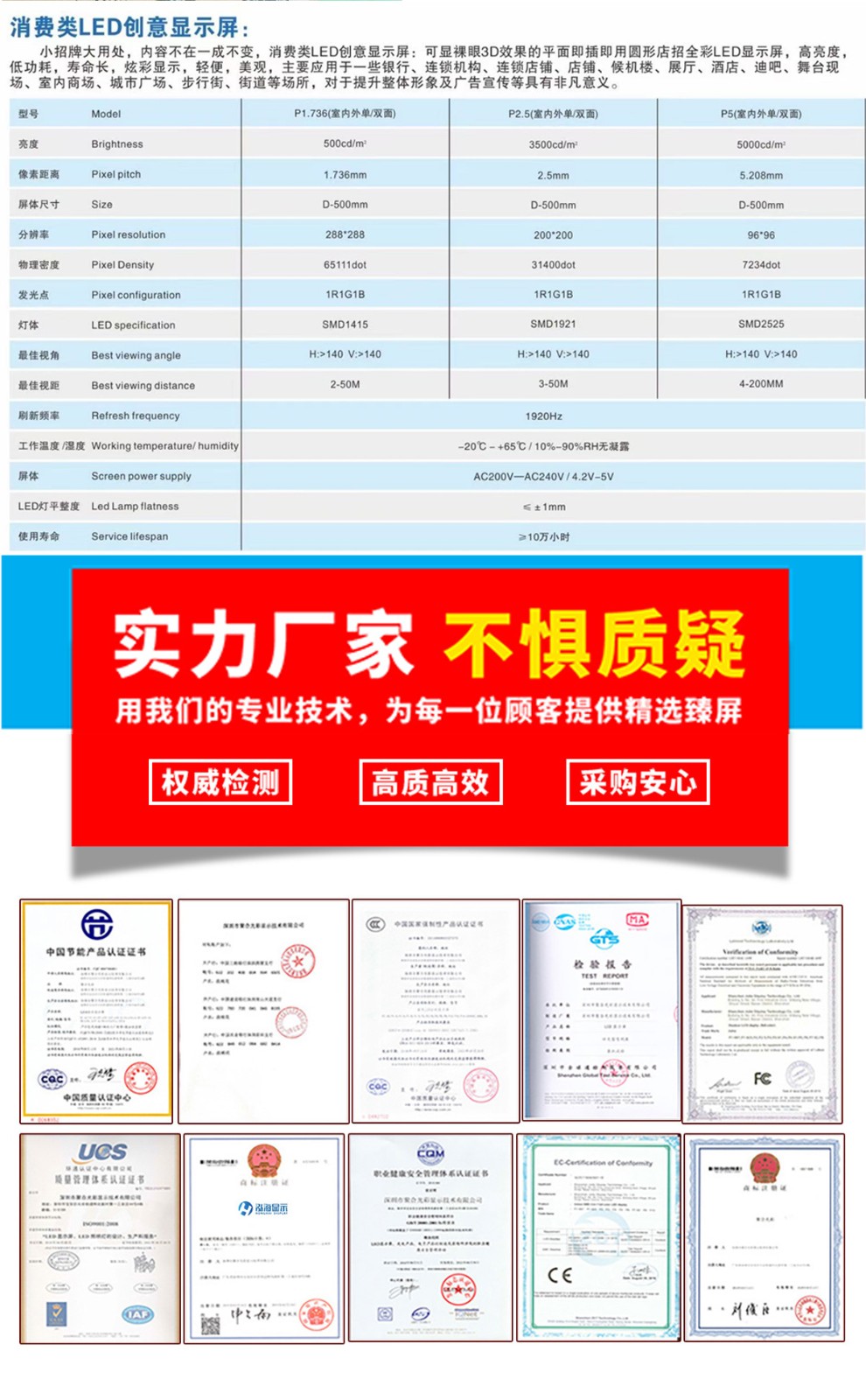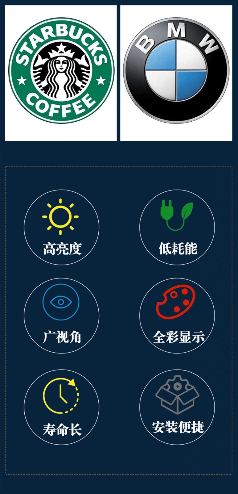 小招牌大用处,LED创意显示屏:可显裸眼3D效果的平面即插即用圆形店招全尺寸LED显示屏,高亮度,低功耗,寿命长,轻便,美观。主要用于一些银行、连锁店铺、候机楼、展厅、酒店、酒吧、室内商场、城市广场等场所,对于提升整体形象及广告宣传等具有非凡意义。