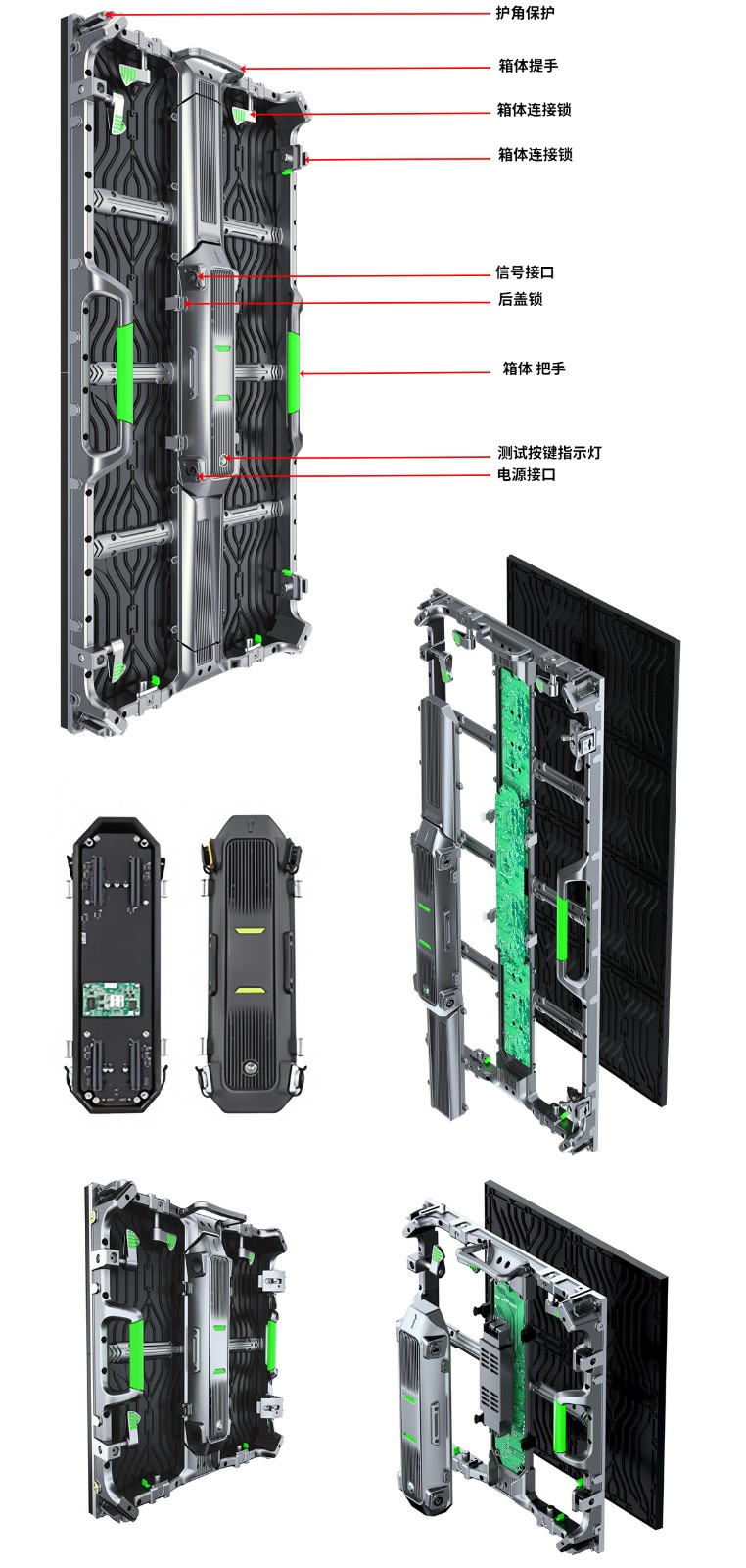 前后均可维护,硬连接方式,易于安装无缝拼接。弧形锁可选,箱体超轻超薄采用压铸铝成型,强度高,韧性强,精度高不易变形,为运输省力。